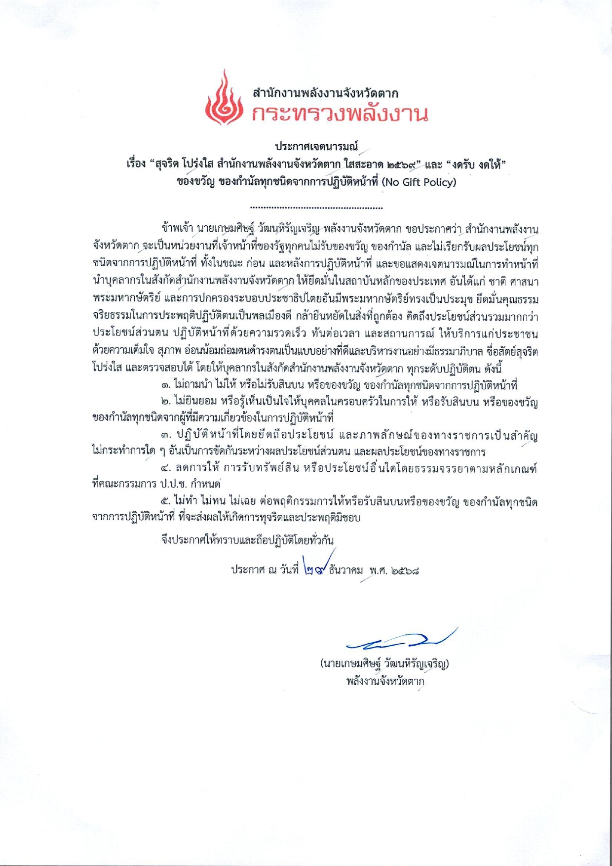 ประกาศเจตนารมณ์ เรื่อง สุจริต โปร่งใส สำนักงานพลังงานจังหวัดตาก ใสสะอาด 2569” และ ”งดรับ งดให้” ของขวัญ ของกำนัลทุกชนิดจากการปฏิบัติหน้าที่ (No Gift Policy)